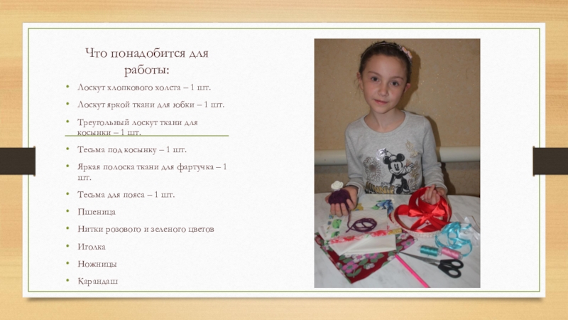 Что понадобится для работы:Лоскут хлопкового холста – 1 шт.Лоскут яркой ткани для юбки – 1 шт.Треугольный лоскут