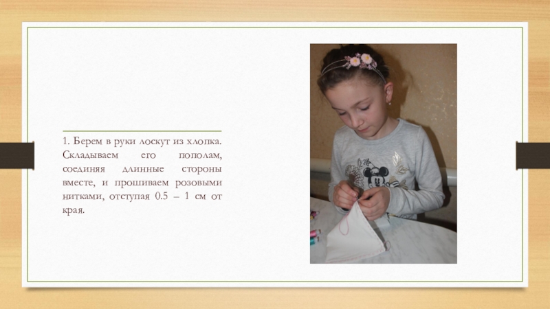1. Берем в руки лоскут из хлопка. Складываем его пополам, соединяя
