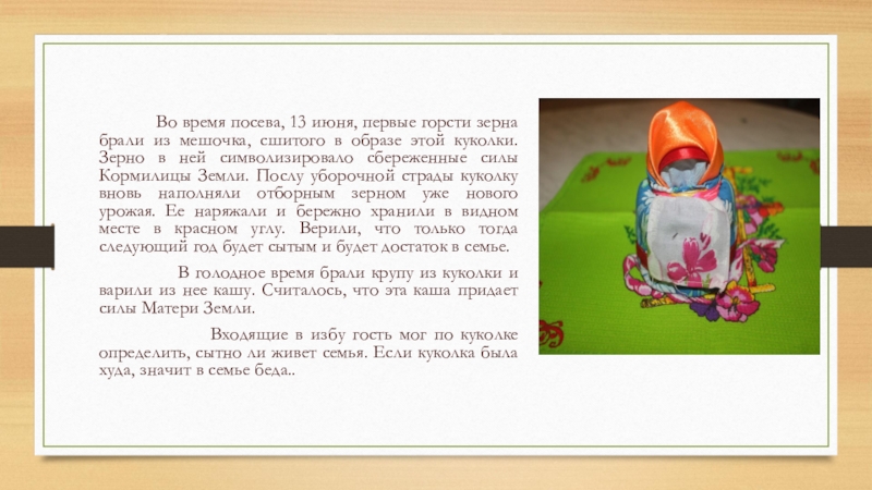 Во время посева, 13 июня, первые горсти зерна брали из мешочка, сшитого в образе этой куколки. Зерно в ней символизировало сбереженные силы Кормилицы Земли. Послу уборочной страды куколку вновь наполняли отборным зерном уже нового урожая. Ее наряжали и бережно хранили в видном месте в красном углу. Верили, что только тогда следующий год будет сытым и будет достаток в семье.