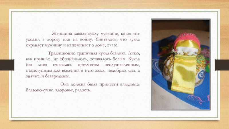 мужчине, когда тот уходил в дорогу или на войну. Считалось, что кукла охраняет мужчину и напоминает о доме, очаге.