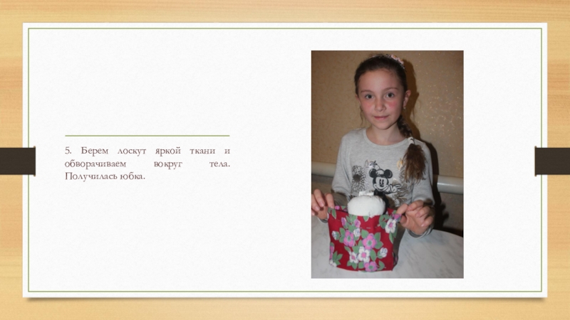 5. Берем лоскут яркой ткани и обворачиваем вокруг тела. Получилась юбка.