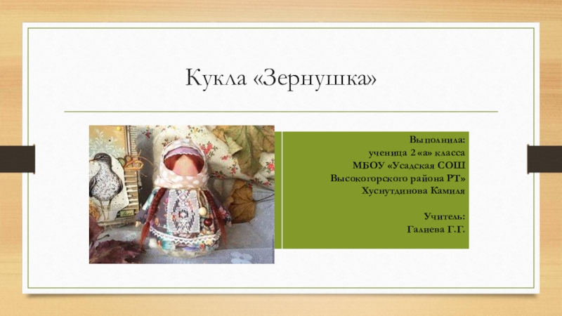 Кукла «Зернушка» - это оберег на сытость и достаток в семье. Традиционно эту куклу наполняли гречишным зерном или пшеницей. Это главная кукла в семье. Кукла-зернушка – символ урожая, богатства, еды, ее дарили на