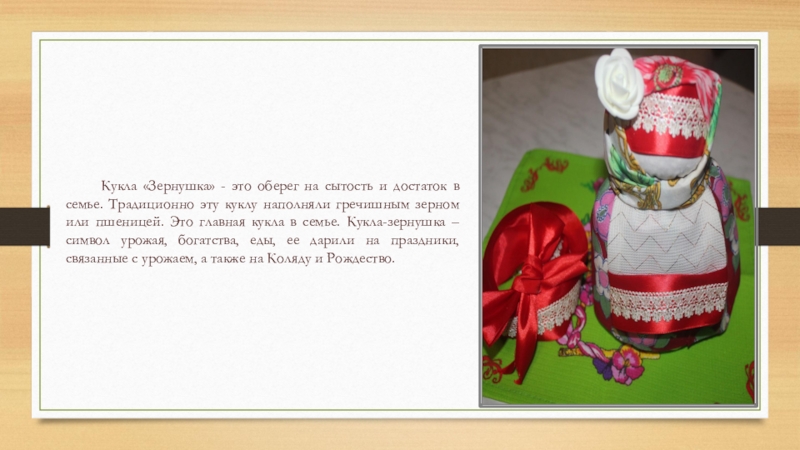 достаток в семье. Традиционно эту куклу наполняли гречишным зерном или пшеницей. Это главная кукла в семье. Кукла-зернушка – символ урожая, богатства, еды, ее дарили на праздники, связанные с урожаем, а также на Коляду и Рождество.