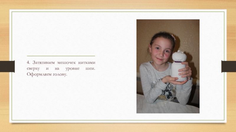 Слайд 94. Затягиваем мешочек нитками сверху и на уровне шеи. Оформляем голову.