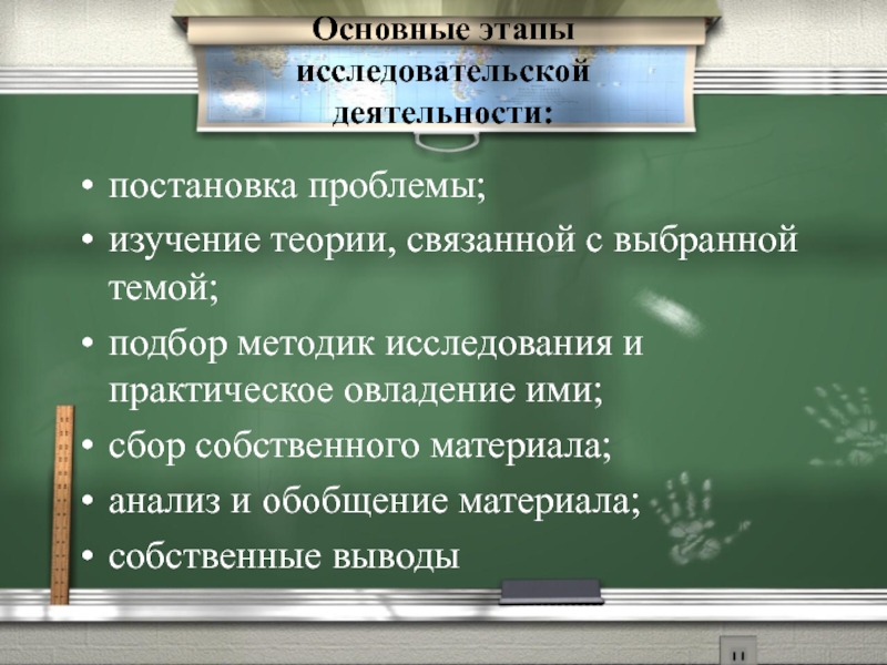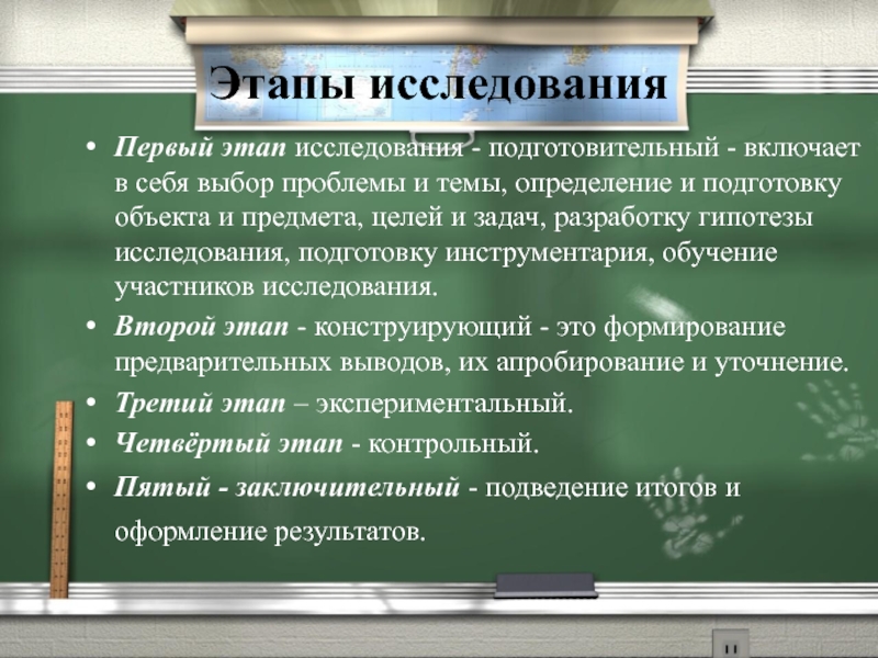 проблемы и темы, определение и подготовку объекта и предмета, целей и задач, разработку гипотезы исследования, подготовку инструментария, обучение участников исследования.