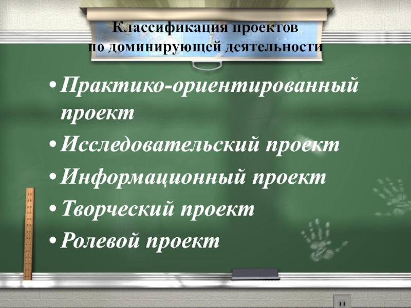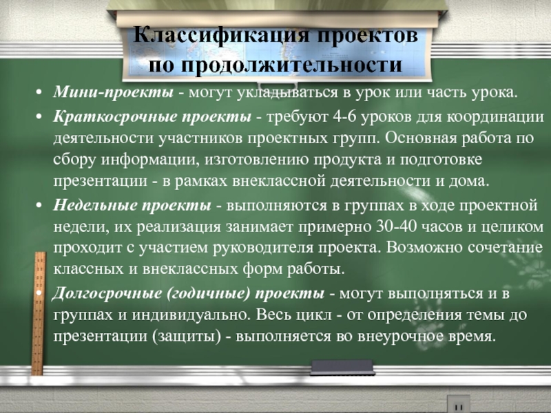 Краткосрочные проекты - требуют 4-6 уроков для координации деятельности участников проектных групп. Основная работа по сбору информации, изготовлению продукта и подготовке презентации - в рамках внеклассной деятельности и дома.
