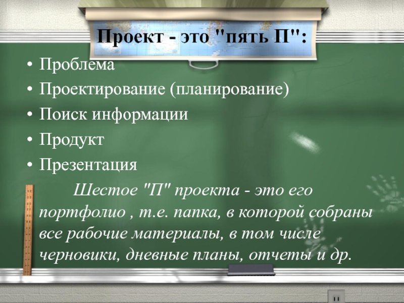 Шестое "П" проекта - это его портфолио , т.е. папка, в которой собраны все рабочие материалы, в том числе черновики, дневные планы, отчеты и др.