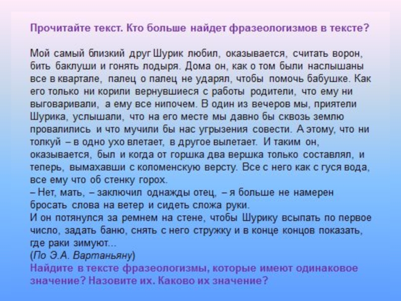 Самое главное – мы узнали много фразеологизмов, о которых раньше и не слышали. Поистине, велик и могуч наш русский язык!