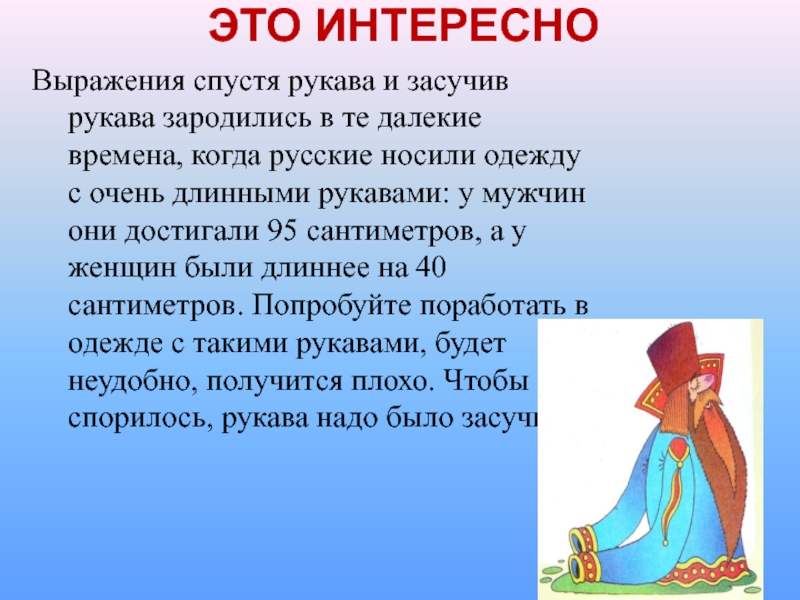 времена, когда русские носили одежду с очень длинными рукавами: у мужчин они достигали 95 сантиметров, а у женщин были длиннее на 40 сантиметров. Попробуйте поработать в одежде с такими рукавами, будет неудобно, получится плохо. Чтобы дело спорилось, рукава надо было засучить.