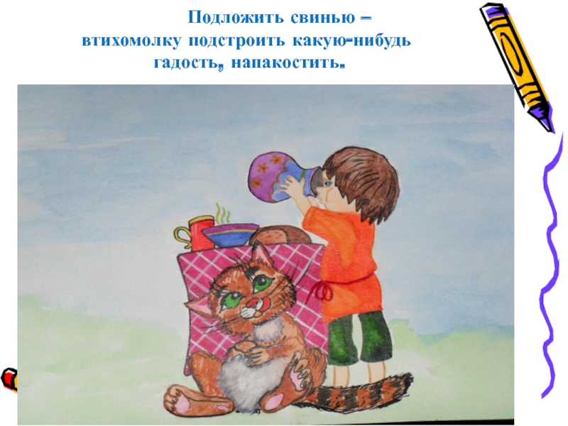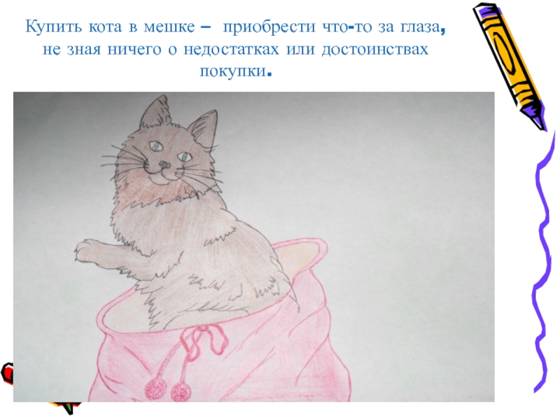 Слайд 39Купить кота в мешке – приобрести что-то за глаза, не зная