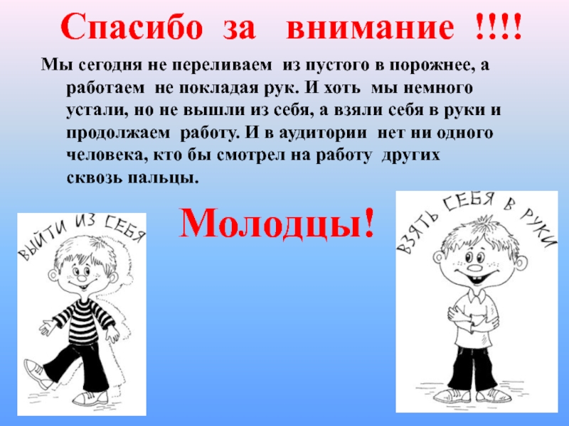 в порожнее, а работаем не покладая рук. И хоть мы немного устали, но не вышли из себя, а взяли себя в руки и продолжаем работу. И в аудитории нет ни одного человека, кто бы смотрел на работу других сквозь пальцы.
