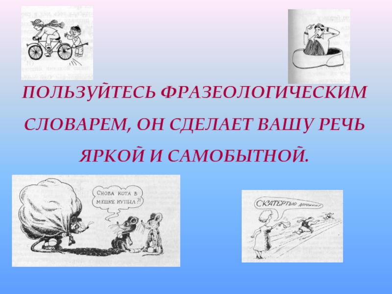 Слайд 56ПОЛЬЗУЙТЕСЬ ФРАЗЕОЛОГИЧЕСКИМ СЛОВАРЕМ, ОН СДЕЛАЕТ ВАШУ РЕЧЬ ЯРКОЙ И САМОБЫТНОЙ.