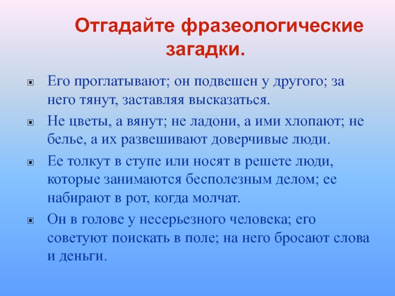 Cамая главная черта фразеологизмов – их образно-переносный смысл.