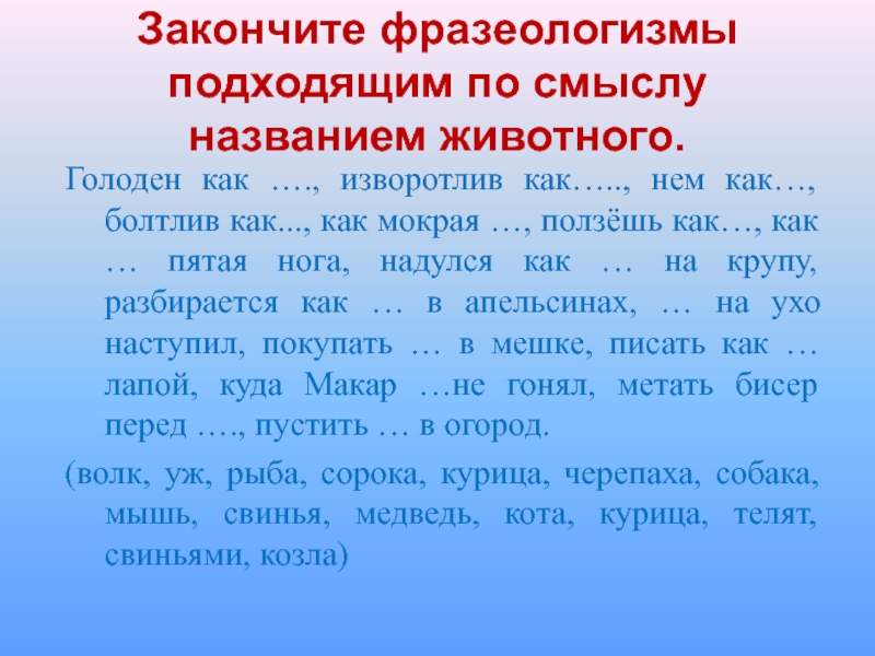 Слайд 51Закончите фразеологизмы подходящим по смыслу названием животного.