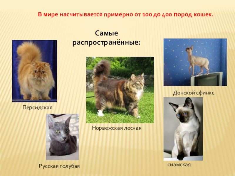 Слайд 11В мире насчитывается примерно от 100 до 400 пород кошек.