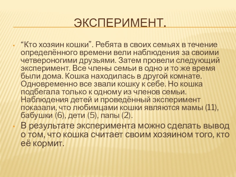 вели наблюдения за своими четвероногими друзьями. Затем провели следующий эксперимент. Все члены семьи в одно и то же время были дома. Кошка находилась в другой комнате. Одновременно все звали кошку к себе. Но кошка подбегала только к одному из членов семьи. Наблюдения детей и проведённый эксперимент показали, что любимцами кошки являются мамы (11), бабушки (6), дети (5), папы (2).