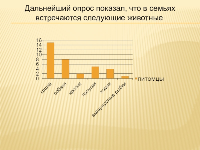 Слайд 8Дальнейший опрос показал, что в семьях встречаются следующие животные: