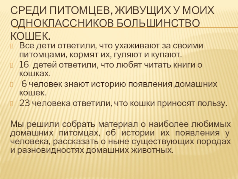 Слайд 9Среди питомцев, живущих у моих одноклассников большинство кошек.