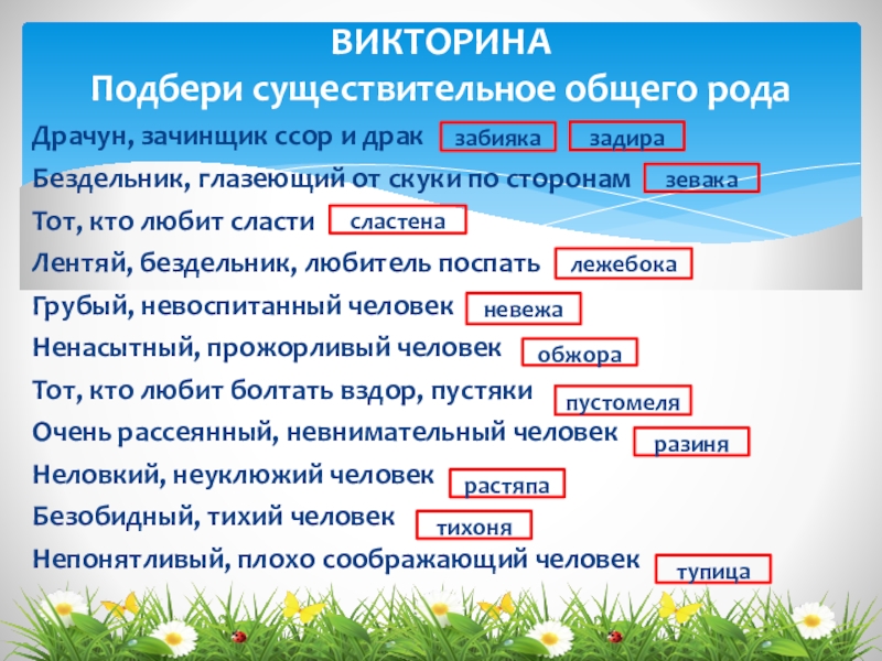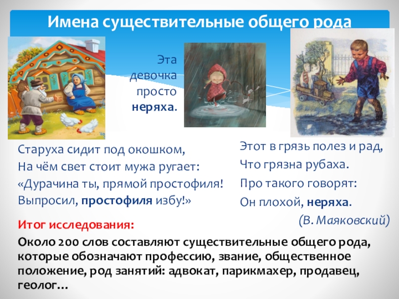 Около 200 слов составляют существительные общего рода, которые обозначают профессию, звание, общественное положение, род занятий: адвокат, парикмахер, продавец, геолог…