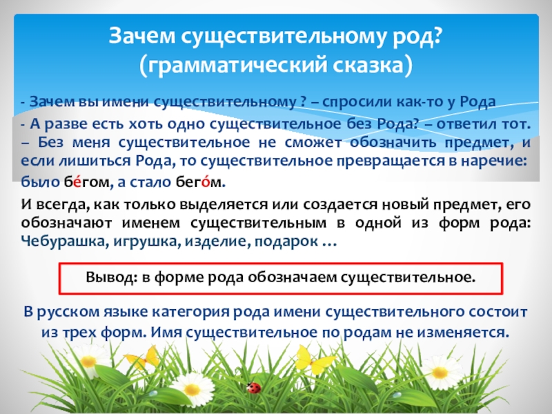 В русском языке категория рода имени существительного состоит из трех форм. Имя существительное по родам не изменяется.