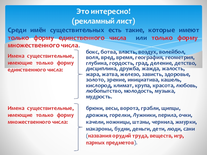 брюки, весы, ворота, грабли, щипцы, дрожжи, горелки, Лужники, перила, очки, качели, ножницы, штаны, чернила, жмурки, макароны, будни, деньги, дети, люди, сани (названия орудий труда, веществ, игр, парных предметов).
