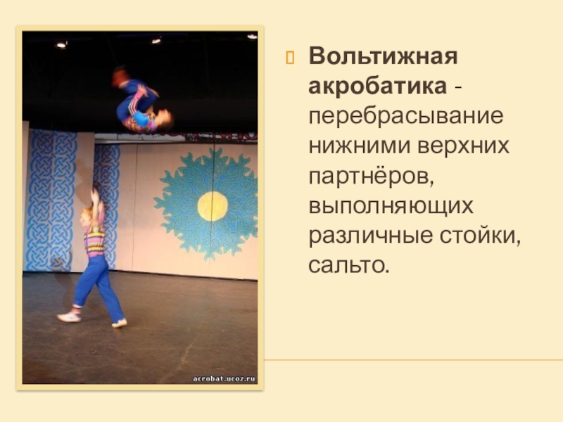 Слайд 18Вольтижная акробатика - перебрасывание нижними верхних партнёров, выполняющих различные стойки, сальто.