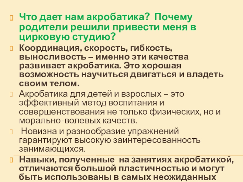 Слайд 20Что дает нам акробатика? Почему родители решили привести меня в цирковую