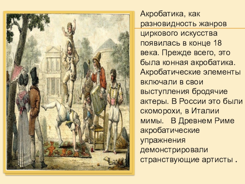 Слайд 10Акробатика, как разновидность жанров циркового искусства появилась в конце 18 века.
