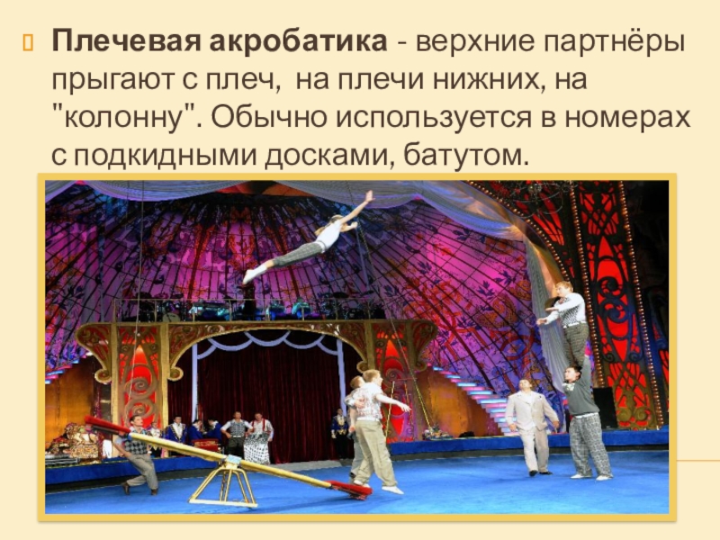 Слайд 15Плечевая акробатика - верхние партнёры прыгают с плеч, на плечи нижних,