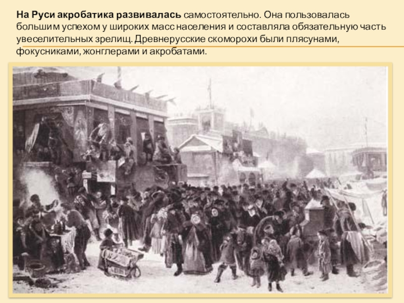 Слайд 11На Руси акробатика развивалась самостоятельно. Она пользовалась большим успехом у широких