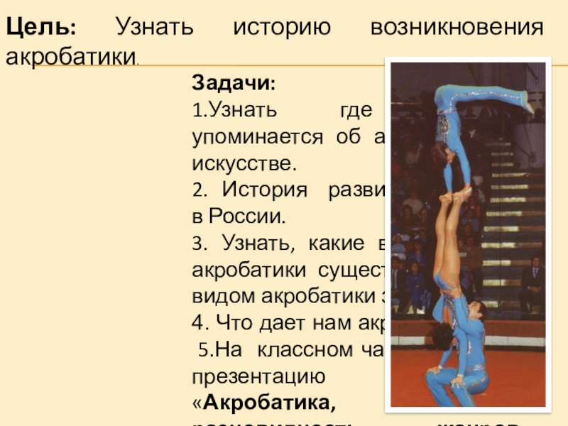Слайд 2Цель: Узнать историю возникновения акробатики.