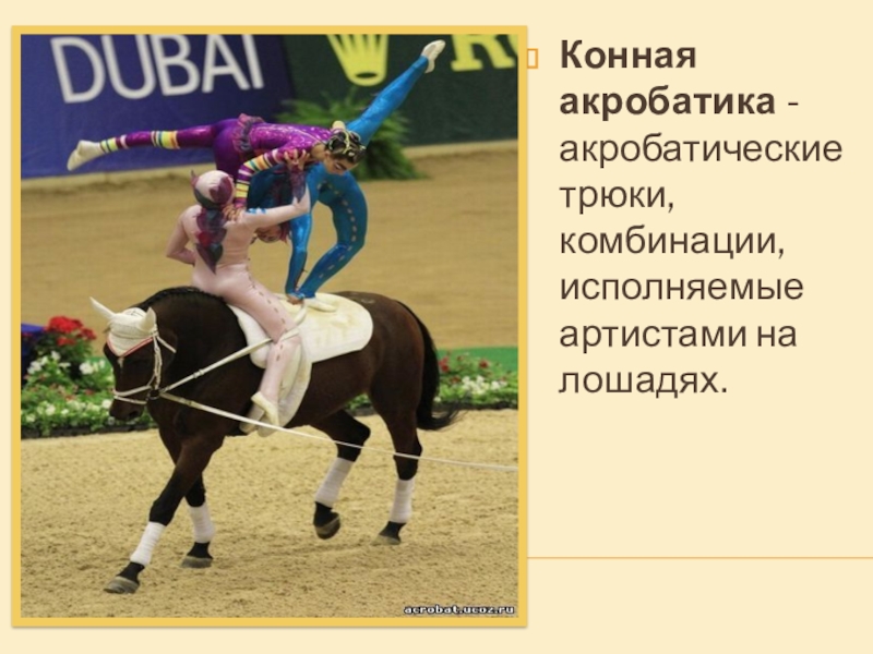Слайд 19Конная акробатика - акробатические трюки, комбинации, исполняемые артистами на лошадях.