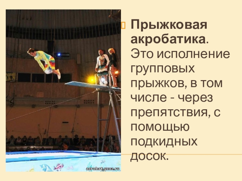 Слайд 14Прыжковая акробатика. Это исполнение групповых прыжков, в том числе - через