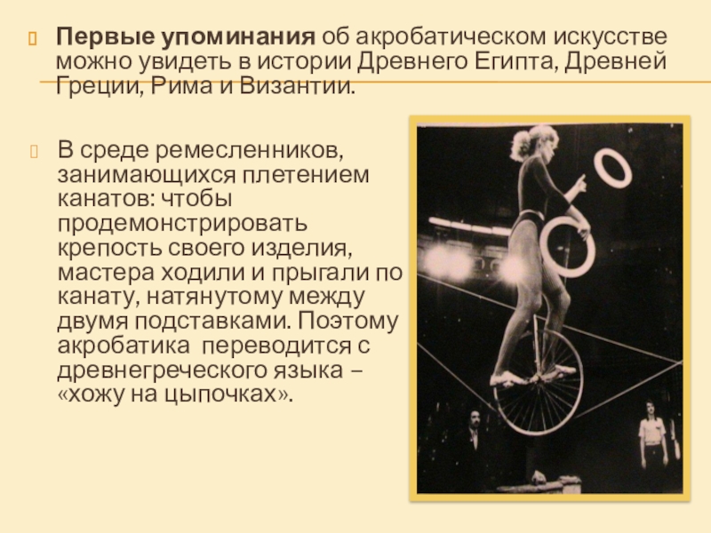мастера ходили и прыгали по канату, натянутому между двумя подставками. Поэтому акробатика переводится с древнегреческого языка – «хожу на цыпочках».