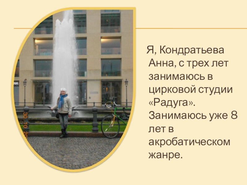 Слайд 4 Я, Кондратьева Анна, с трех лет занимаюсь в цирковой