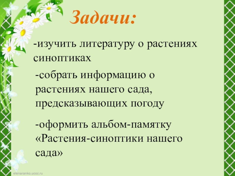 -оформить альбом-памятку «Растения-синоптики нашего сада»