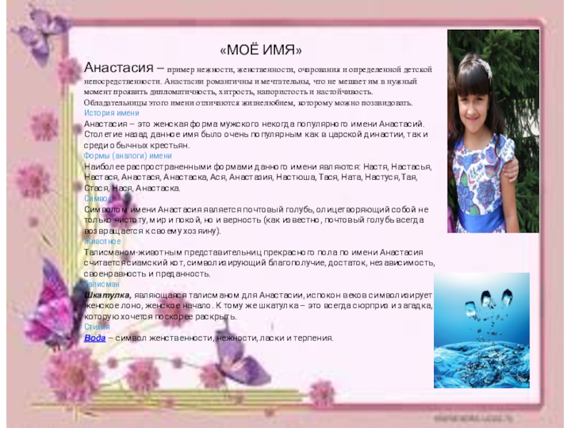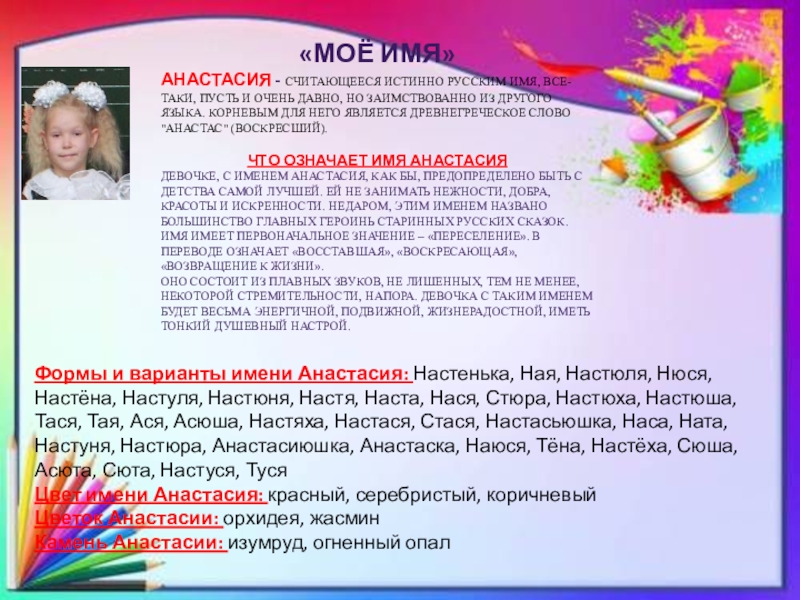 Формы и варианты имени Анастасия: Настенька, Ная, Настюля, Нюся, Настёна, Настуля, Настюня, Настя, Наста, Нася, Стюра, Настюха, Настюша, Тася, Тая, Ася, Асюша, Настяха, Настася, Стася, Настасьюшка, Наса, Ната, Настуня, Настюра, Анастасиюшка, Анастаска, Наюся, Тёна, Настёха, Сюша, Асюта, Сюта, Настуся, Туся