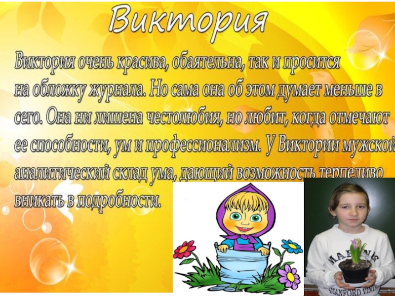 Для Владиславы характерны в первую очередь такие черты как целеустремленность, трудолюбие и привлекательность. Владислава расстается с застенчивостью и становится более уверенной в себе. Происходит эта трансформация постепенно с взрослением. Еще это дает Владиславе много жизненной энергии и позитивный настрой. Она умеет заряжать позитивом окружающих ее людей, что конечно делает ее еще более популярной. Знакомы у Владиславы очень много, а вот близких друзей всего несколько.