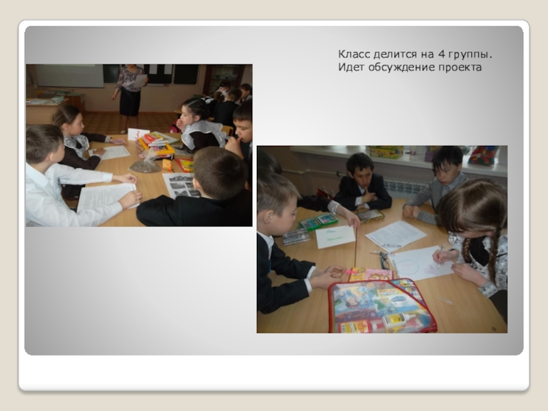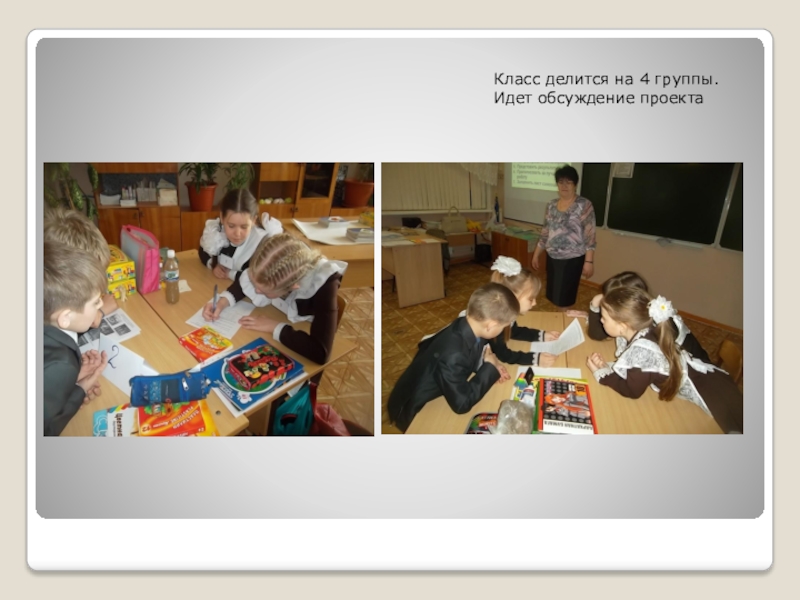 Слайд 3Класс делится на 4 группы. Идет обсуждение проекта
