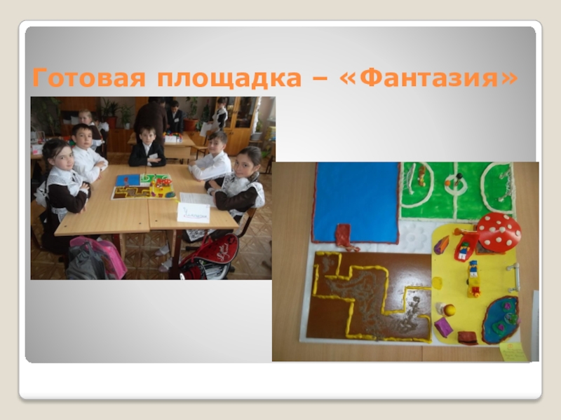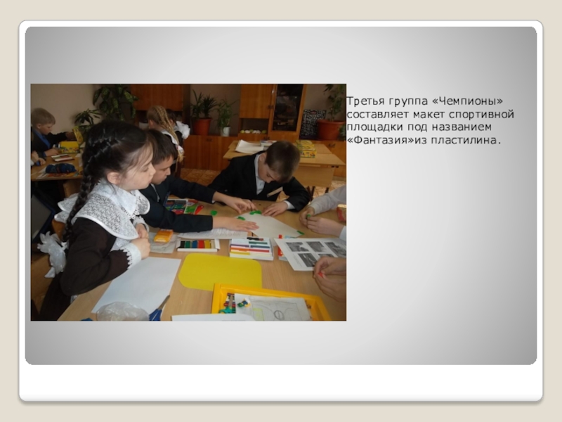 Слайд 6Третья группа «Чемпионы» составляет макет спортивной площадки под названием «Фантазия»из пластилина.