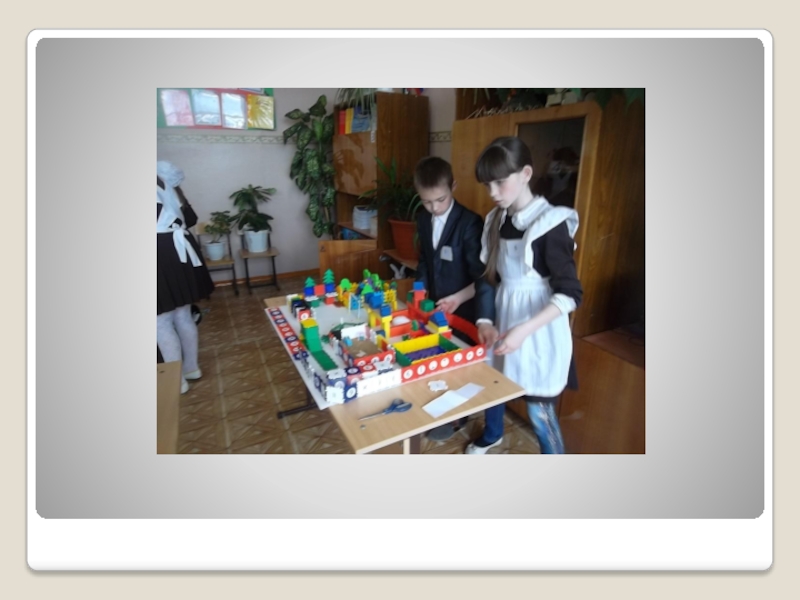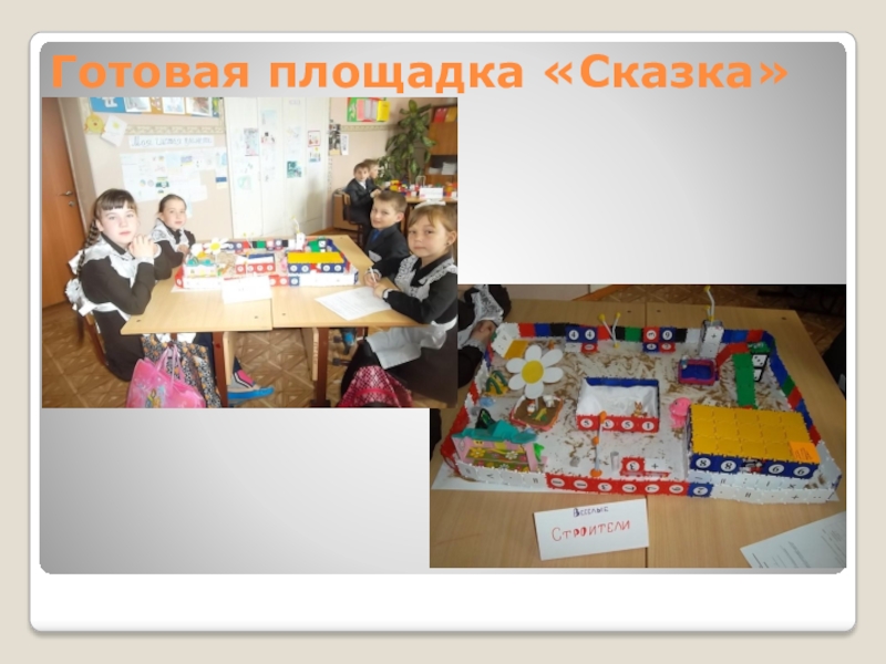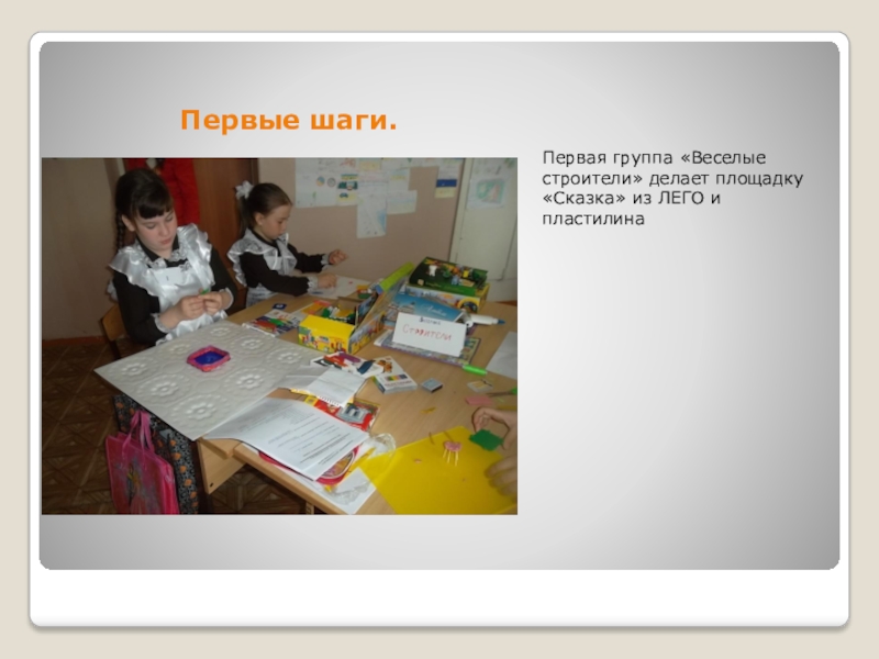 Первые шаги.Первая группа «Веселые строители» делает площадку «Сказка» из ЛЕГО и пластилина