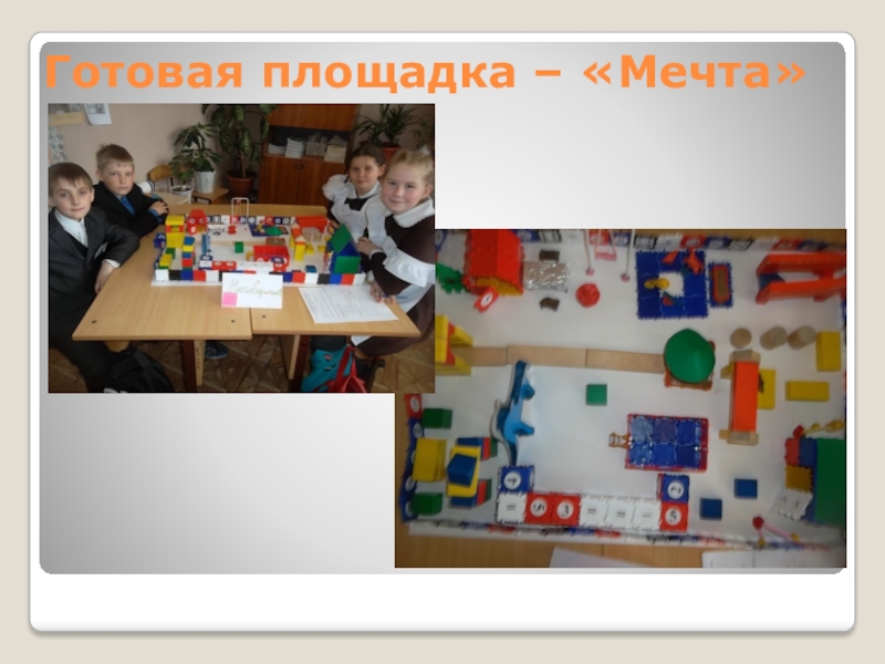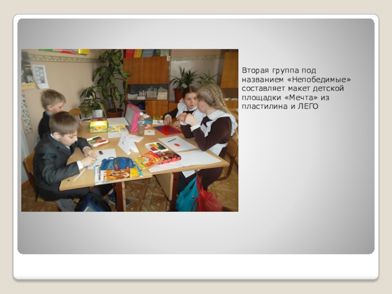 Слайд 5Вторая группа под названием «Непобедимые» составляет макет детской площадки «Мечта» из