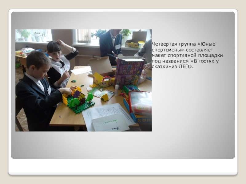 Слайд 7Четвертая группа «Юные спортсмены» составляет макет спортивной площадки под названием «В