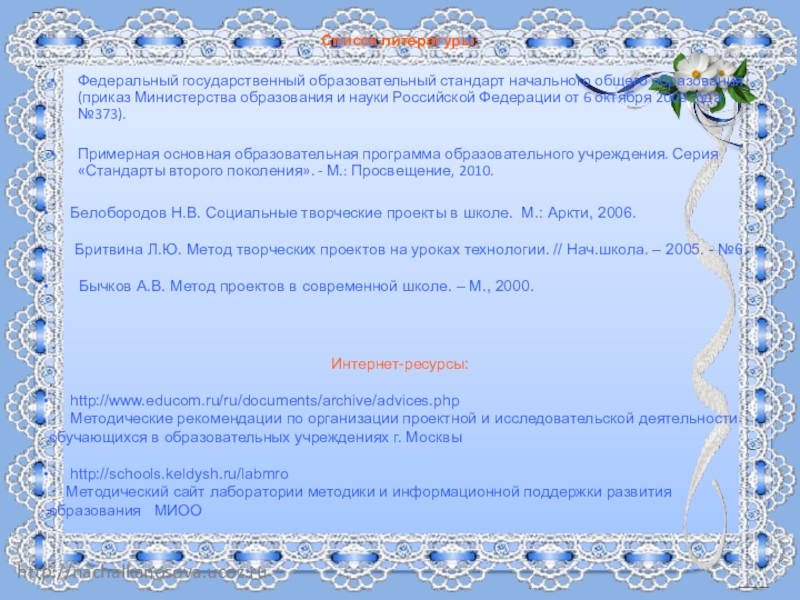 Белобородов Н.В. Социальные творческие проекты в школе. М.: Аркти, 2006.