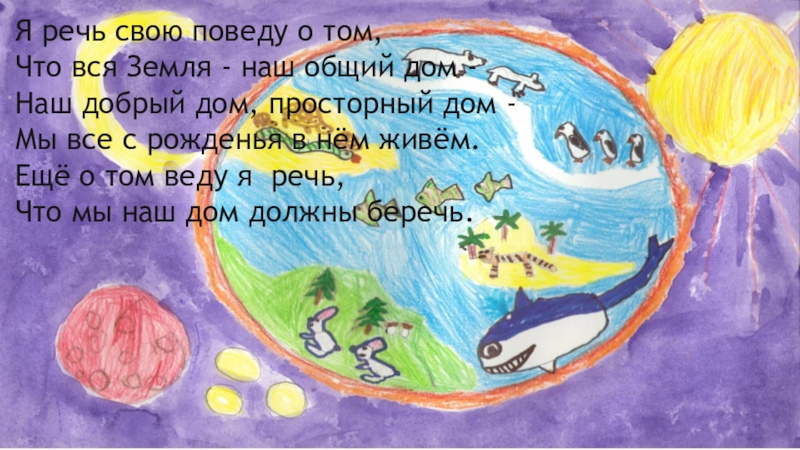 Я речь свою поведу о том, Что вся Земля - наш общий дом - Наш добрый дом, просторный дом - Мы все с рожденья в нём живём. Ещё о том веду я речь, Что мы