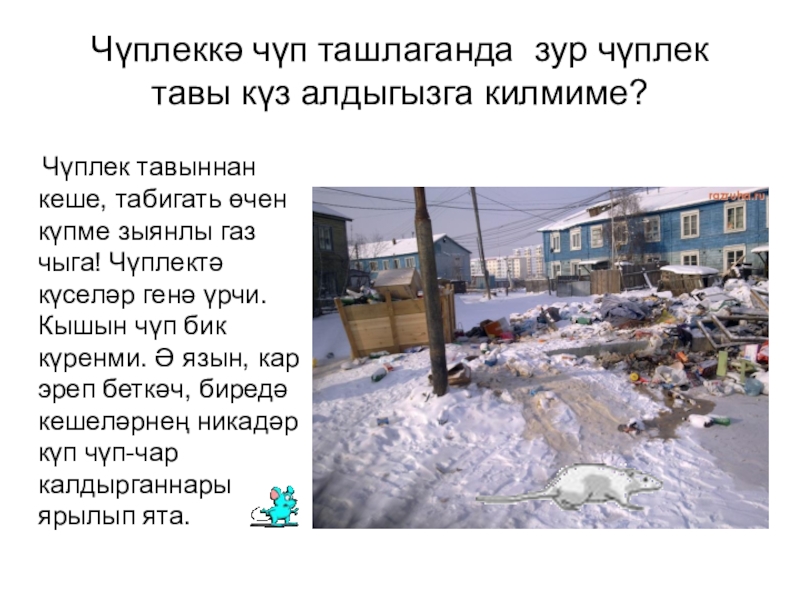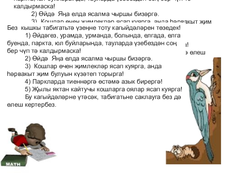 1) Әйдәгез, урамда, урманда, болында, елгада, елга буенда, паркта, юл буйларында, тауларда үзебездән соң бер чүп тә калдырмаска!