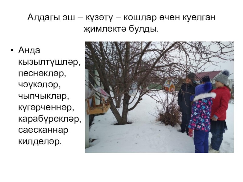 3) Кошлар өчен җимлекләр ясап куярга, анда һәрвакыт җим булуын күзәтеп торырга!