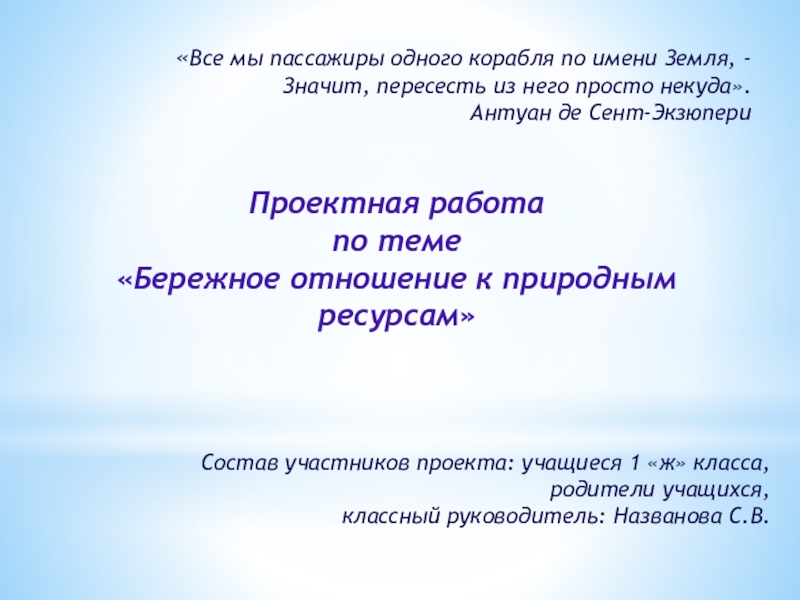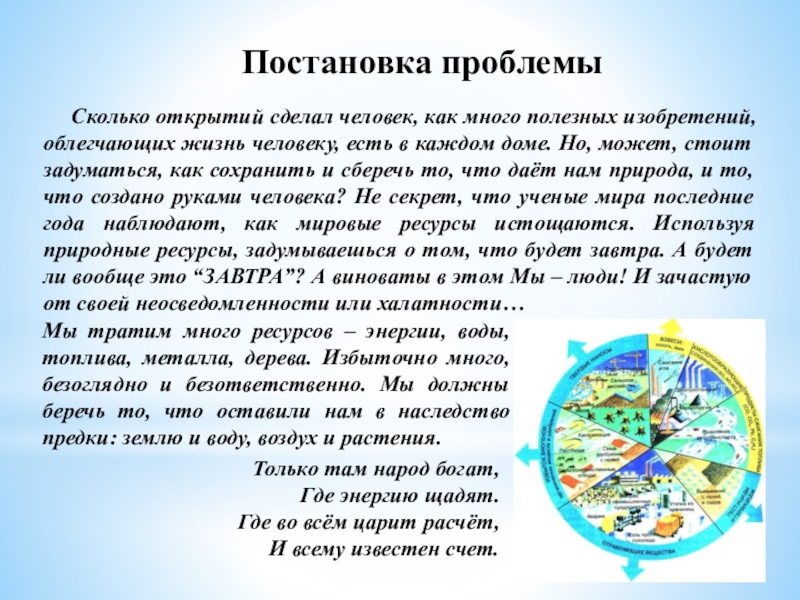 Мы тратим много ресурсов – энергии, воды, топлива, металла, дерева. Избыточно много, безоглядно и безответственно. Мы должны беречь то, что оставили нам в наследство предки: землю и воду, воздух и растения.
