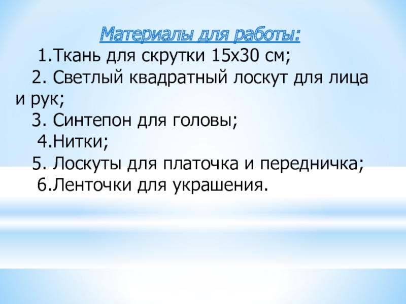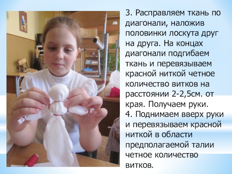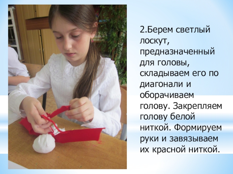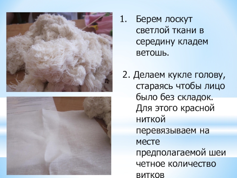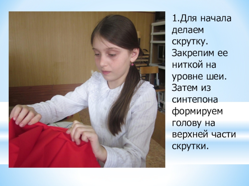 Слайд 291.Для начала делаем скрутку. Закрепим ее ниткой на уровне шеи. Затем
