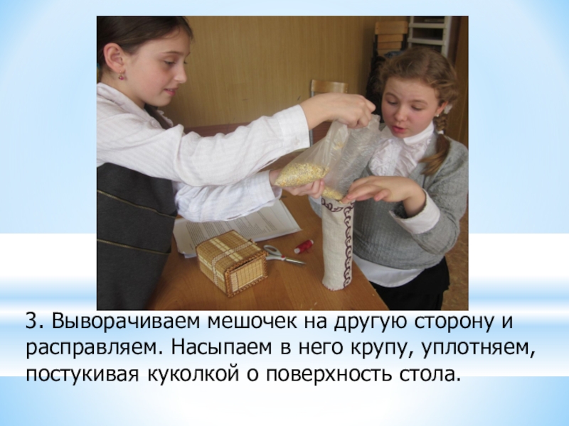 Слайд 143. Выворачиваем мешочек на другую сторону и расправляем. Насыпаем в него
